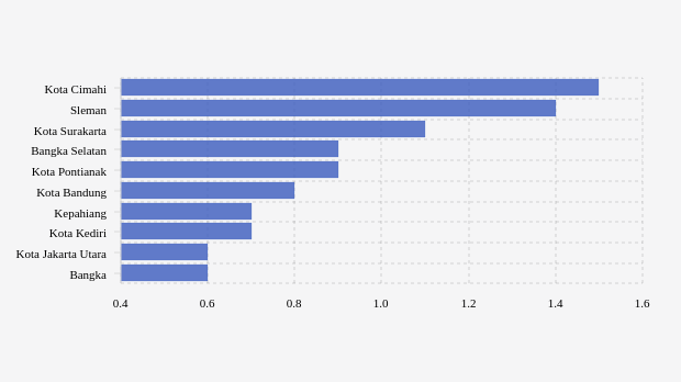 Penggunaan rawat inap lima kabupaten/kota teratas dengan angka lebih dari 0,89 pasien per 100 ribu penduduk/minggu, yaitu kota Cimahi, Sleman, kota Surakarta, Bangka Selatan dan kota Pontianak dengan masing-masing nilai 1,47 pasien per 100 ribu penduduk/minggu, 1,38 pasien per 100 ribu penduduk/minggu, 1,15 pasien per 100 ribu penduduk/minggu, 0,93 pasien per 100 ribu penduduk/minggu dan 0,89 pasien per 100 ribu penduduk/minggu.
