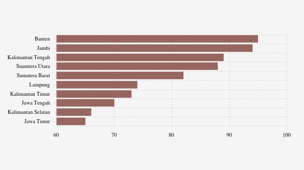 Di bawah Banten, ada Jambi yang menempati posisi kedua terburuk di Indonesia dengan indeks kualitas udara 94. Kemudian, di posisi ketiga ada Kalimantan Tengah dengan indeks kualitas udara 89.