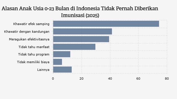 Menurut laporan Badan Pusat Statistik (BPS), sebanyak 74,43% anak berusia 0-23 bulan di Indonesia tidak menerima imunisasi karena orang tuanya khawatir dengan efek samping dalam vaksin.