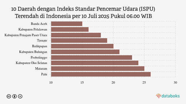 Kualitas udara Banda Aceh pagi ini paling bersih di Indonesia. Berdasarkan indeks kualitas udara versi Kementerian Lingkungan Hidup dan Kehutanan (KLHK), Banda Aceh memiliki skor 15 pada Kamis (10/7/2025) pukul 06.00 WIB.