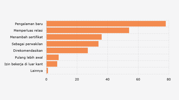 Selain itu, sebagian responden mengikuti acara offline karena berpeluang pulang lebih awal dari kantor (8%) atau untuk mendapatkan izin bekerja di luar kantor (7%).