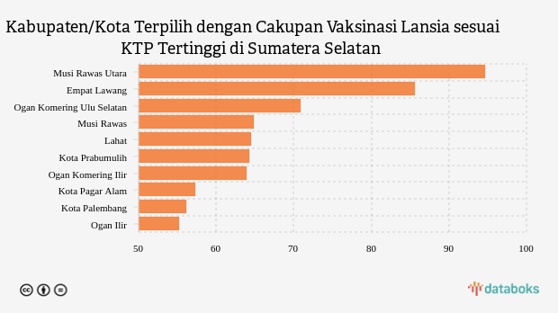 Musi rawas utara adalah kabupaten di urutan pertama dengan cakupan vaksinasi lansia sesuai identitas KTP tertinggi sebesar 94,68 persen. Kondisi cakupan vaksinasi lansia sesuai identitas KTP di kabupaten ini terlihat menurun dibandingkan pekan sebelumnya yang tercatat 94,8 persen.