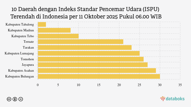 Kualitas udara Kabupaten Tabalong pagi ini paling bersih di Indonesia. Berdasarkan indeks kualitas udara versi Kementerian Lingkungan Hidup dan Kehutanan (KLHK), Kabupaten Tabalong memiliki skor 2 pada Sabtu (11/10/2025) pukul 06.00 WIB.