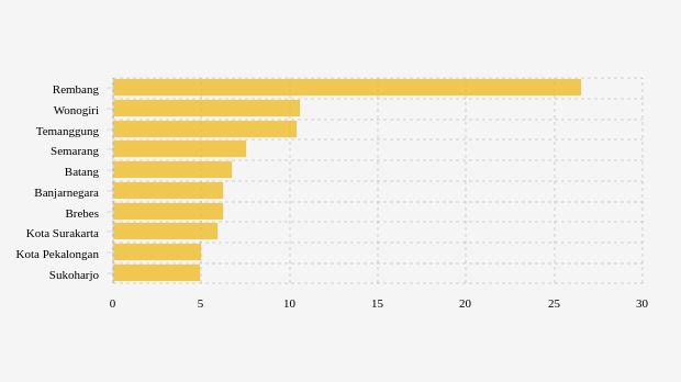 Rembang adalah kabupaten di urutan pertama dengan BOR tertinggi sebesar 26,47 persen. Kondisi BOR di kabupaten ini memperlihatkan ada kemajuan dengan adanya penurunan dibandingkan pekan sebelumnya yang tercatat 26,47 persen.
