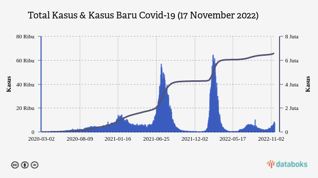 Pasien positif Covid-19 bertambah 7.822 orang per 17 November 2022. Dengan tambahan tersebut, saat ini total kasus Covid-19 di Indonesia telah mencapai 6.590.113.
