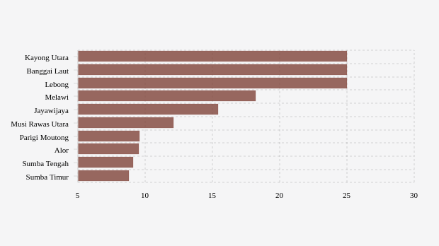 positivity rate tujuh hari terakhir lima kabupaten/kota teratas dengan angka lebih dari 15,38 persen, yaitu Kayong Utara, Banggai Laut, Lebong, Melawi dan Jayawijaya dengan masing-masing nilai 25 persen, 25 persen, 25 persen, 18,18 persen dan 15,38 persen.