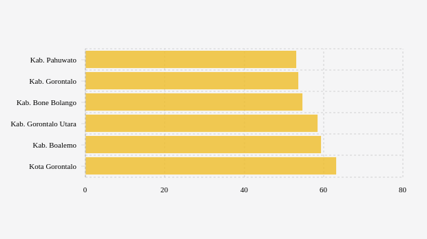 Menyusul berikutnya adalah kabupaten Gorontalo. Untuk vaksinasi dosis 2, daerah ini masuk nomor dua terendah. Dengan sasaran vaksin sebanyak 316,7 ribu peserta, namun telah berhasil direalisasikan 53,59 persen atau 169,71 ribu peserta.