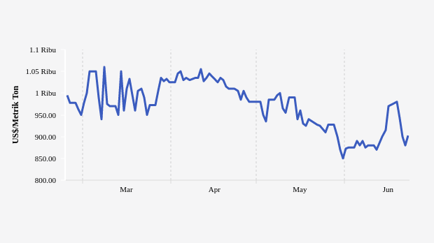 Harga minyak sawit (Crude Palm Oil/CPO) di Pasar Spot Rotterdam turun 4,51% menjadi US$ 900 per Metrik Ton pada perdagangan Jumat, 23 Juni 2023, dari penutupan sehari sebelumnya. Harga CPO sempat menyentuh level tertingginya US$ 1.065 per Metrik Ton yang terjadi pada Senin, 02 Januari 2023.
