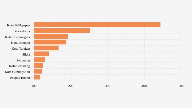 Kota Balikpapan berada di urutan pertama. Dengan jumlah penduduk 649,42 ribu jiwa, persentase orang diperiksa per minggu di tempat ini tercatat 443,94 persen. Adapun angka positive rate terakhir adalah 0,38 persen. Positive rate di wilayah ini telah turun dibandingkan rasio pada pekan sebelumnya.