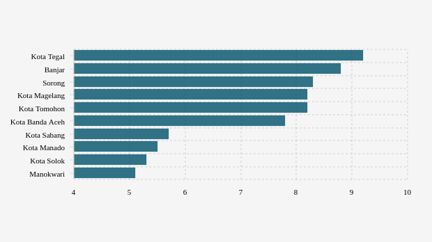 Penggunaan rawat inap lima kabupaten/kota teratas dengan angka lebih dari 8,15 pasien per 100 ribu penduduk/minggu, yaitu kota Tegal, Banjar, Sorong, kota Magelang dan kota Tomohon dengan masing-masing nilai 9,19 pasien per 100 ribu penduduk/minggu, 8,81 pasien per 100 ribu penduduk/minggu, 8,33 pasien per 100 ribu penduduk/minggu, 8,2 pasien per 100 ribu penduduk/minggu dan 8,15 pasien per 100 ribu penduduk/minggu.