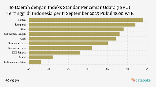 Berikut daftar 10 provinsi dengan indeks kualitas udara terburuk di Indonesia pada Kamis, 11 September 2025 pukul 18.00 WIB.