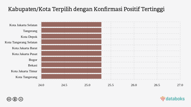 Konfirmasi positif lima kabupaten/kota teratas dengan angka lebih dari 25,3 jiwa per 100 ribu penduduk/minggu, yaitu kota Jakarta Selatan, Tangerang, kota Depok, kota Tangerang Selatan dan kota Jakarta Barat dengan masing-masing nilai 25,3 jiwa per 100 ribu penduduk/minggu, 25,3 jiwa per 100 ribu penduduk/minggu, 25,3 jiwa per 100 ribu penduduk/minggu, 25,3 jiwa per 100 ribu penduduk/minggu dan 25,3 jiwa per 100 ribu penduduk/minggu.
