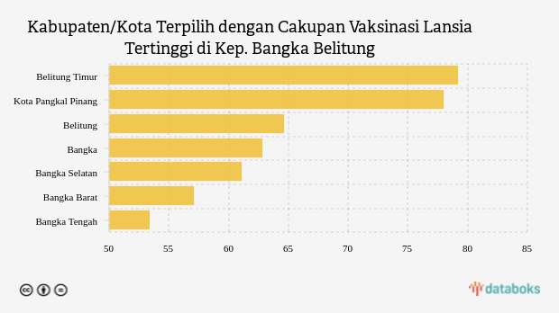 Belitung timur adalah kabupaten di urutan pertama dengan cakupan vaksinasi lansia tertinggi sebesar 79,23 persen. Kondisi cakupan vaksinasi lansia di kabupaten ini terlihat menurun dibandingkan pekan sebelumnya yang tercatat 81,8 persen.