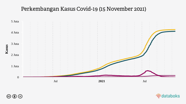 Pemerintah melaporkan kasus Covid-19 di Indonesia bertambah 221 kasus pada Senin (15/11). Dengan begitu, total kasusnya menjadi 4.251.076 kasus. Sebanyak 4.098.884 orang di antaranya telah dinyatakan sembuh (96.42%) dan 143.670 orang meninggal dunia (3.38%), sementara sisanya masih menjalani perawatan.