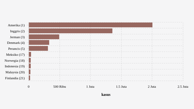 Kemudian, jumlah kasus Omicron di Jerman naik 0,57 persen menjadi 491,03 ribu kasus dibandingkan pekan sebelumnya, Denmark dengan jumlah kasus Omicron 331,26 ribu kasus (naik 1,02%) dan jumlah kasus Omicron di Perancis naik 1,11 persen menjadi 311,19 ribu kasus dibandingkan pekan sebelumnya