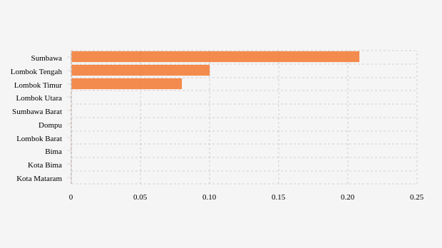 Masih di urutan lima besar selain dua wilayah di atas adalah Lombok Timur, Lombok Utara dan Sumbawa Barat. Masing-masing mencatatkan jumlah konfirmasi mingguan sebanyak 0,08 kasus dan dua wilayah lain tidak mencatatkan kasus.