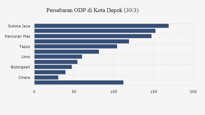 Kecamatan Sukma Jaya, Depok memiliki 169 orang dalam pemantauan (ODP) Covid-19 per Senin (30/3). Angka itu setara dengan 15,2% dari total 1.114 ODP di Kota Depok. Jumlah itu menjadikan Sukma Jaya sebagai wilayah dengan ODP terbanyak di Kota Depok.