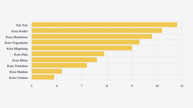 Penggunaan rawat inap lima kabupaten/kota teratas dengan angka lebih dari 9,02 pasien per 100 ribu penduduk/minggu, yaitu Toli Toli, kota Kediri, kota Mojokerto, kota Yogyakarta dan kota Magelang dengan masing-masing nilai 10,8 pasien per 100 ribu penduduk/minggu, 10,24 pasien per 100 ribu penduduk/minggu, 9,85 pasien per 100 ribu penduduk/minggu, 9,34 pasien per 100 ribu penduduk/minggu dan 9,02 pasien per 100 ribu penduduk/minggu.