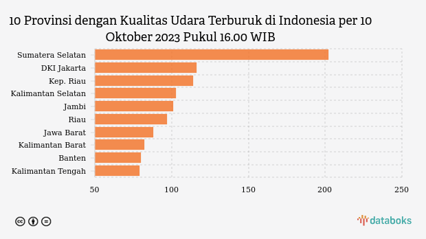 Berikut daftar 10 provinsi dengan indeks kualitas udara terburuk di Indonesia pada Selasa, 10 Oktober 2023 pukul 16.00 WIB.