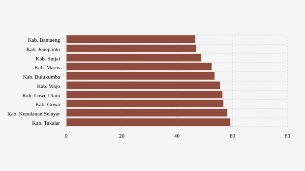 Menyusul berikutnya adalah kabupaten Jeneponto. Untuk vaksinasi dosis 2, daerah ini masuk nomor dua terendah. Dengan sasaran vaksin sebanyak 313,31 ribu peserta, namun baru direalisasikan 46,73 persen atau 146,41 ribu peserta.