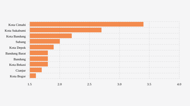 Urutan selanjutnya ditempati kota Sukabumi dan kota Bandung yang masing-masing dengan catatan positivity rate tujuh hari terakhir sebesar 2,73 persen dan 2,23 persen