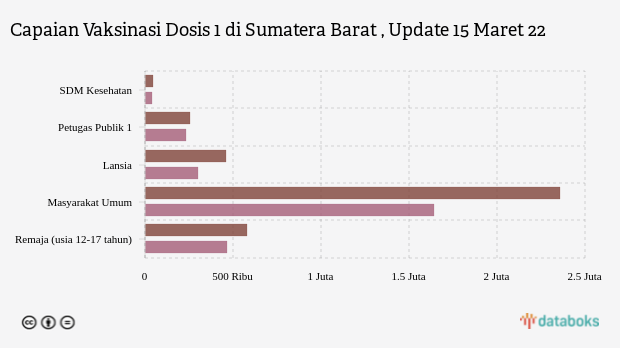Cakupan vaksinasi dosis 1 di provinsi Sumatera Barat, hari ini Selasa, 15 Maret 2022, telah mencapai 88,48 persen. Angka ini setara dengan 3,9 juta peserta vaksin dari target yang ditetapkan sebanyak 4,41 juta orang. Sementara untuk vaksinasi dosis 2 hingga kemarin telah tercapai 62 persen dari target.