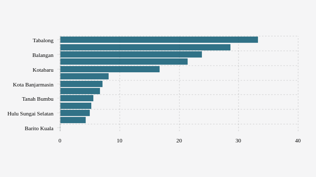 Tabalong adalah kabupaten di urutan pertama dengan BOR aglomerasi mingguan tertinggi sebesar 33,16 persen. Kondisi BOR aglomerasi mingguan di kabupaten ini terlihat belum membaik karena terjadi peningkatan dibandingkan pekan sebelumnya yang tercatat 25,51 persen.