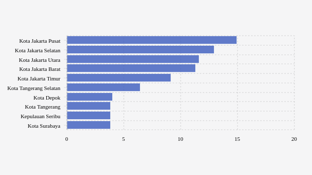 Konfirmasi positif lima kabupaten/kota teratas dengan angka lebih dari 9,05 jiwa per 100 ribu penduduk/minggu, yaitu kota Jakarta Pusat, kota Jakarta Selatan, kota Jakarta Utara, kota Jakarta Barat dan kota Jakarta Timur dengan masing-masing nilai 14,87 jiwa per 100 ribu penduduk/minggu, 12,95 jiwa per 100 ribu penduduk/minggu, 11,6 jiwa per 100 ribu penduduk/minggu, 11,32 jiwa per 100 ribu penduduk/minggu dan 9,05 jiwa per 100 ribu penduduk/minggu.