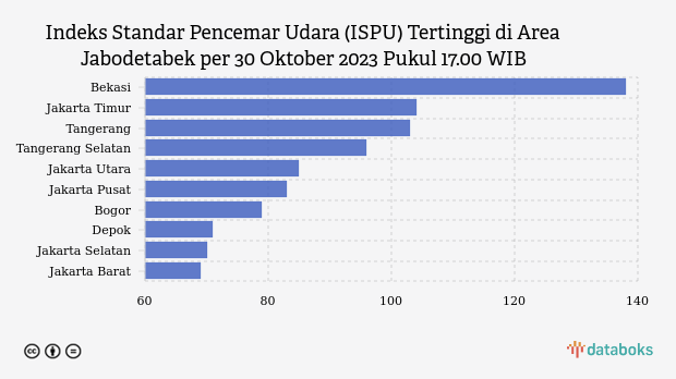 Kualitas udara Bekasi sore ini terburuk di Jabodetabek berdasarkan data Indeks Standar Pencemar Udara (ISPU) KLHK. Adapun indeks kualitas udara Bekasi tercatat 138 pada Senin (30/10/2023) pukul 17.00 WIB.