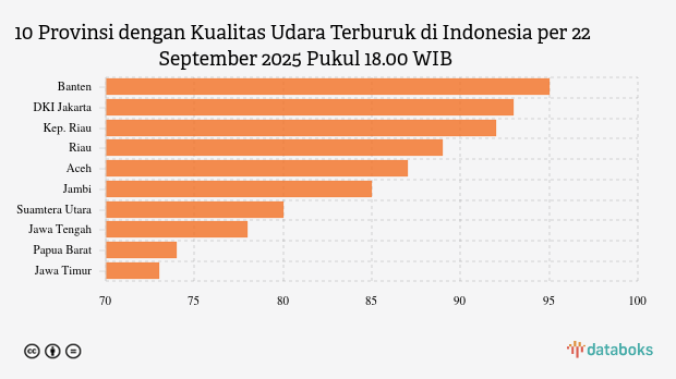 Berikut daftar 10 provinsi dengan indeks kualitas udara terburuk di Indonesia pada Senin, 22 September 2025 pukul 18.00 WIB.