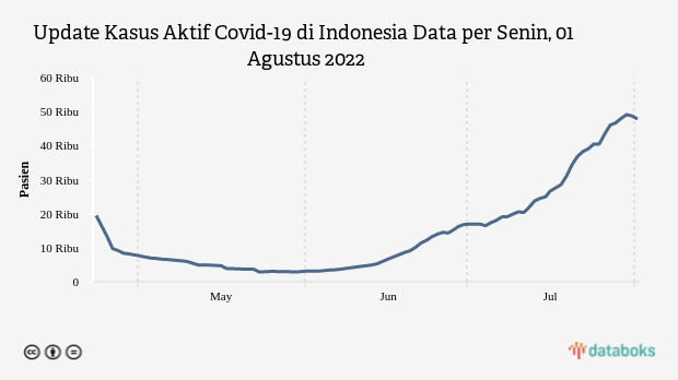 Kasus aktif Covid-19 di Indonesia saat ini kembali mulai menurun. Berdasarkan laporan Satgas Penanganan Covid-19, jumlah kasus aktif Covid-19 di Indonesia kini ada 47.809 kasus aktif per Senin, 01 Agustus 2022.