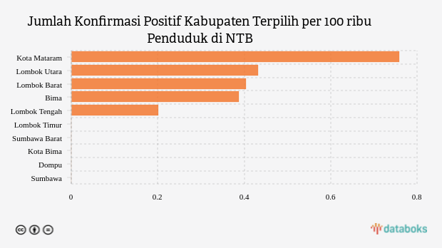 Jumlah penambahan konfirmasi positif Covid-19 di NTB saat ini paling tinggi terjadi di kota Mataram dengan jumlah 0,76 kasus per 100 ribu penduduk per minggu pada Minggu, 16 Januari 2022. Angka ini selisih 0,3 kasus dibandingkan catatan kasus di wilayah lain yang berada di urutan kedua.