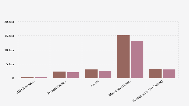 Vaksinasi ke masyarakat umum yang rentan ditargetkan sebanyak 19,3 juta jiwa. Pada dosis 1, vaksinasi dilaporkan telah diberikan sebanyak 15,1 juta jiwa (78,42 persen target). Sedangkan untuk vaksinasi dosis 2 baru tercapai 68,6 persen atau 13,2 juta jiwa.