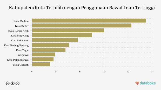 Penggunaan rawat inap lima kabupaten/kota teratas dengan angka lebih dari 7,84 pasien per 100 ribu penduduk/minggu, yaitu kota Madiun, kota Kediri, kota Banda Aceh, kota Magelang dan kota Sukabumi dengan masing-masing nilai 13,46 pasien per 100 ribu penduduk/minggu, 12,29 pasien per 100 ribu penduduk/minggu, 9,99 pasien per 100 ribu penduduk/minggu, 9,02 pasien per 100 ribu penduduk/minggu dan 7,84 pasien per 100 ribu penduduk/minggu.