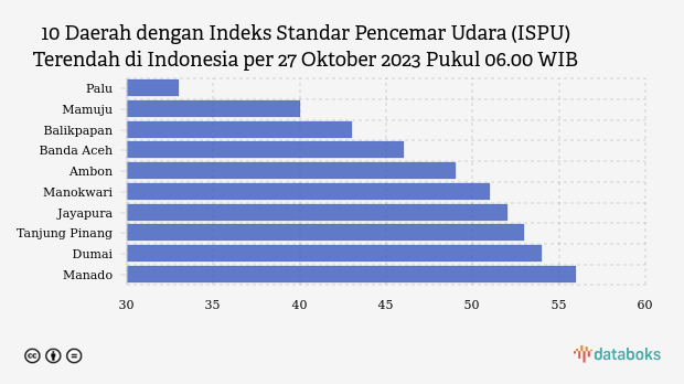 Kualitas udara Palu pagi ini paling bersih di Indonesia. Berdasarkan indeks kualitas udara versi Kementerian Lingkungan Hidup dan Kehutanan (KLHK), Palu memiliki skor 33 pada Jumat (27/10/2023) pukul 06.00 WIB.