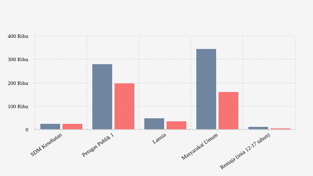 Vaksinasi ke petugas publik dengan target 198,97 ribu jiwa. Vaksinasi dosis 1 dilaporkan telah mencapai 279,17 ribu jiwa (140,3 persen target) dan dosis 2 dengan capaian 99,19 persen atau berhasil tersalurkan sebanyak 197,37 ribu jiwa.