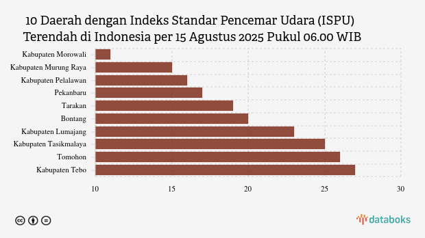 Kualitas udara Kabupaten Morowali pagi ini paling bersih di Indonesia. Berdasarkan indeks kualitas udara versi Kementerian Lingkungan Hidup dan Kehutanan (KLHK), Kabupaten Morowali memiliki skor 11 pada Jumat (15/8/2025) pukul 06.00 WIB.