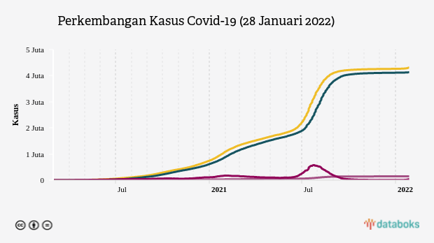 Pemerintah melaporkan kasus Covid-19 di Indonesia bertambah 9.905 kasus pada Jumat (28/1). Dengan begitu, total kasusnya menjadi 4.319.175 kasus. Sebanyak 4.131.333 orang di antaranya telah dinyatakan sembuh (95.65%) dan 144.268 orang meninggal dunia (3.34%), sementara sisanya masih menjalani perawatan.