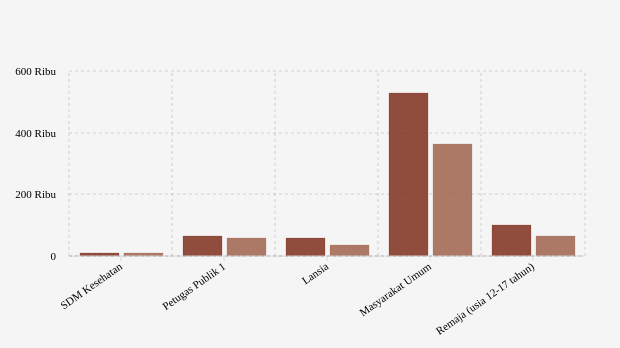 Vaksinasi ke petugas publik dengan target 115,05 ribu jiwa. Vaksinasi dosis 1 dilaporkan telah mencapai 65,7 ribu jiwa (57,11 persen target) dan dosis 2 dengan capaian 50,18 persen atau berhasil tersalurkan sebanyak 57,73 ribu jiwa.