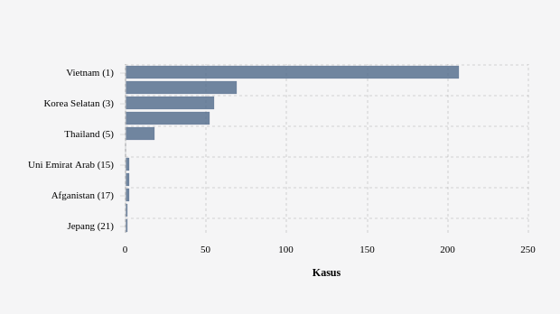Terhadap statistik global, kematian harian di Asia adalah 22,72 persen dari total kasus di seluruh negara. Sementara itu di urutan teratas dengan kematian tertinggi di Asia adalah Vietnam.