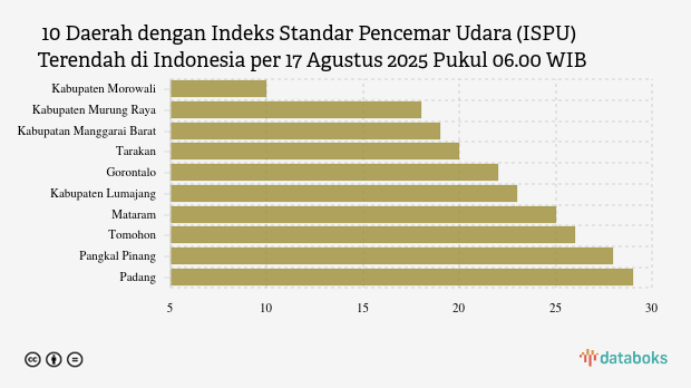 Berikut ini daftar 10 kota dengan kualitas udara paling bersih di Indonesia menurut KLHK pada Minggu, 17 Agustus 2025 pukul 06.00 WIB.