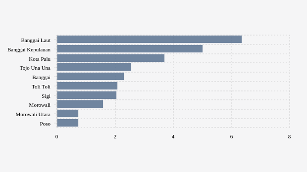 Jumlah penambahan konfirmasi positif Covid-19 di Sulawesi Tengah saat ini paling tinggi terjadi di Banggai Laut dengan jumlah enam kasus per 100 ribu penduduk per minggu pada Minggu, 11 September 2022. Angka ini selisih 1,3 kasus dibandingkan catatan kasus di wilayah lain yang berada di urutan kedua.