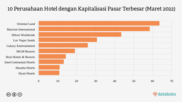 Marriot International berada di peringkat kedua dengan kapitalisasi pasar sebesar US$58,35 miliar, diikuti Hilton Worldwide US$43,35 miliar, dan Las Vegas Sands US$30,55 miliar.