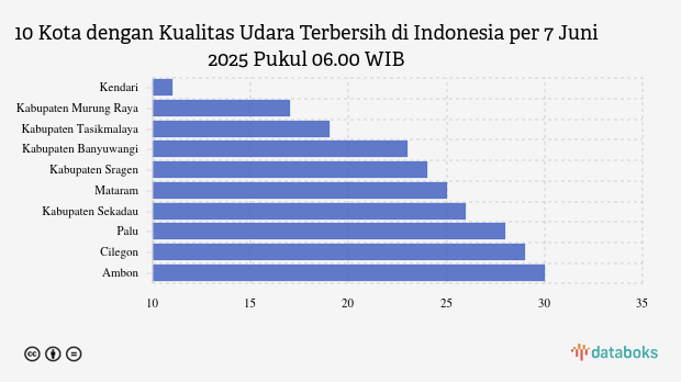 Berikut ini daftar 10 kota dengan kualitas udara paling bersih di Indonesia menurut KLHK pada Sabtu, 7 Juni 2025 pukul 06.00 WIB.