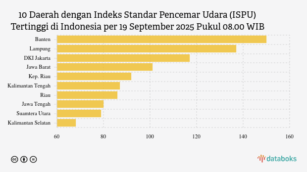 Kualitas Udara di Banten pagi ini terburuk di Indonesia. Berdasarkan halaman Indeks Standar Pencemar Udara (ISPU) Kementerian Lingkungan Hidup dan Kehutanan (KLHK) pada Jumat (19/9/2025) pukul 08.00 WIB terungkap bahwa indeks kualitas udara di Banten sebesar 150.