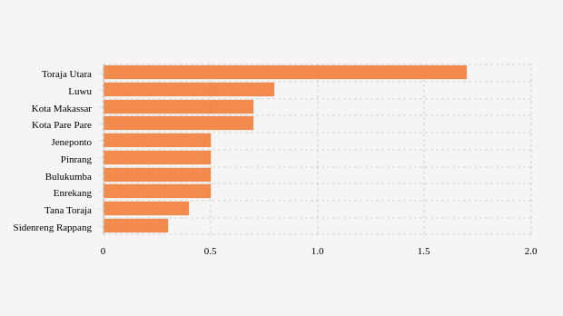 Sebaliknya untuk Luwu, data Kementerian Kesehatan memperlihatkan jumlah konfirmasi positif Covid-19 mingguan sebesar 0,8 jiwa per 100 ribu penduduk/minggu. Angka ini lebih tinggi dibandingkan pekan sebelumnya yang baru 0,27 jiwa per 100 ribu penduduk/minggu. Di urutan berikutnya kota Makassar. Kabupaten di provinsi Sulawesi Selatan ini mencatatkan jumlah konfirmasi positif Covid-19 mingguan sebesar 0,7 jiwa per 100 ribu penduduk/minggu