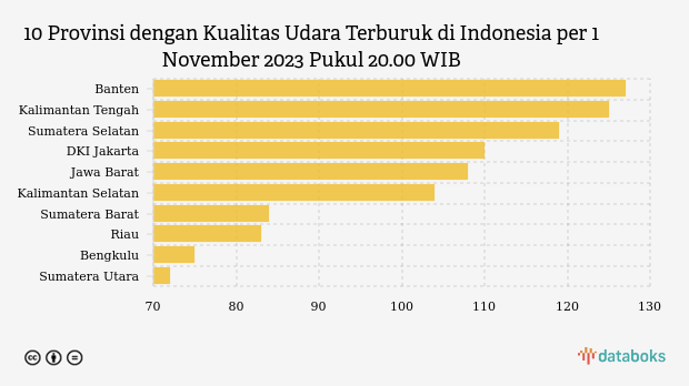 Berikut daftar 10 provinsi dengan indeks kualitas udara terburuk di Indonesia pada Rabu, 1 November 2023 pukul 20.00 WIB.