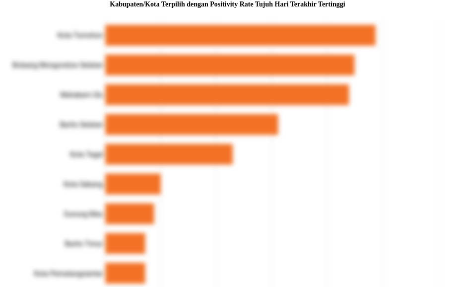 positivity rate tujuh hari terakhir lima kabupaten/kota teratas dengan angka lebih dari 26,46 persen, yaitu kota Tomohon, Bolaang Mongondow Selatan, Mahakam Ulu, Barito Selatan dan kota Tegal dengan masing-masing nilai 39,39 persen, 37,5 persen, 37,04 persen, 30,65 persen dan 26,46 persen.