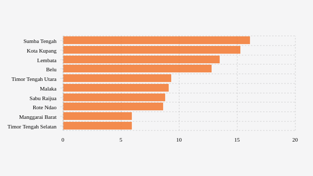 Menurut daftar Kementerian Kesehatan, lima kabupaten/kota berikutnya yang masuk 10 besar adalah Sabu Raijua, Rote Ndao, Manggarai Barat dan Timor Tengah Selatan. Wilayah tersebut secara rata-rata mencatatkan penambahan di atas lima kasus per 100 ribu penduduk.