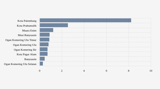 Masih di urutan lima besar selain dua wilayah di atas adalah Muara Enim, Musi Banyuasin dan Ogan Komering Ulu Timur. Masing-masing mencatatkan jumlah konfirmasi mingguan sebanyak 1,21 kasus, 0,89 kasus dan 0,86 kasus.
